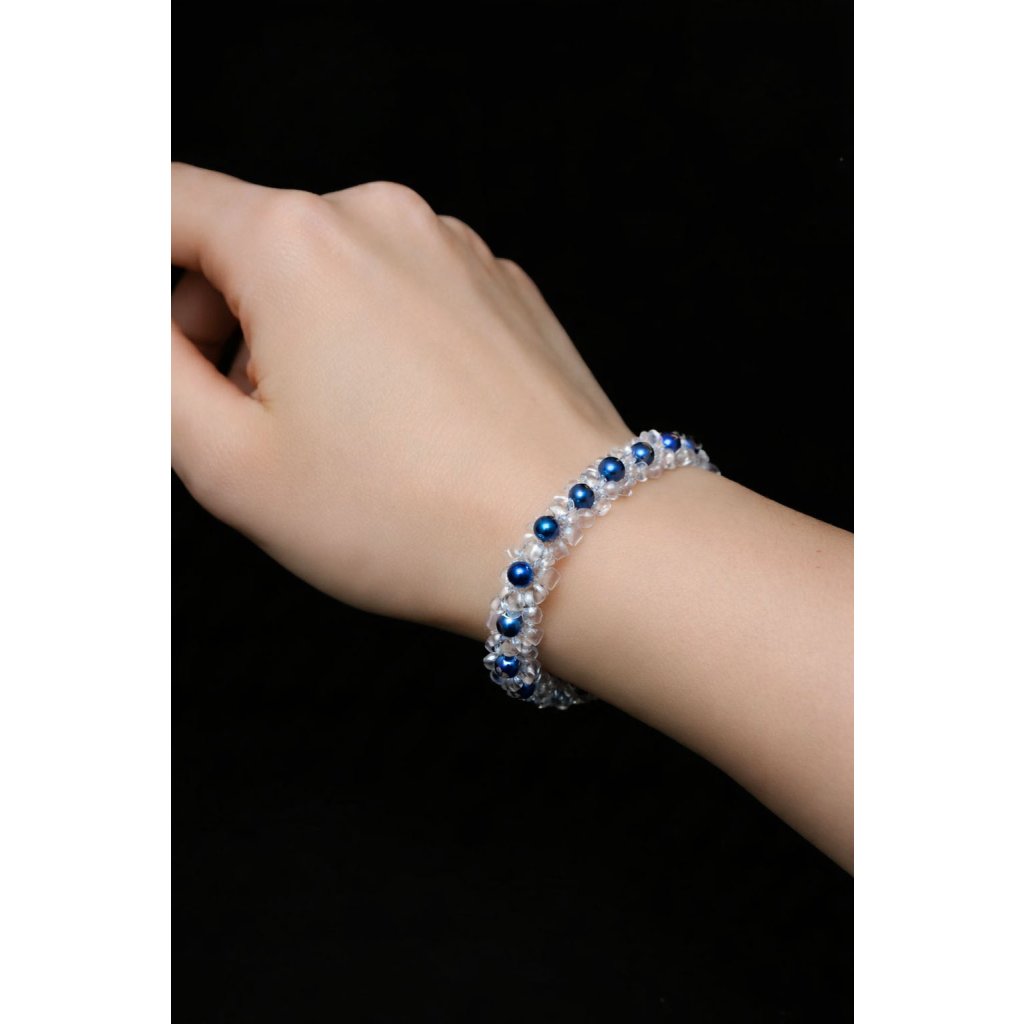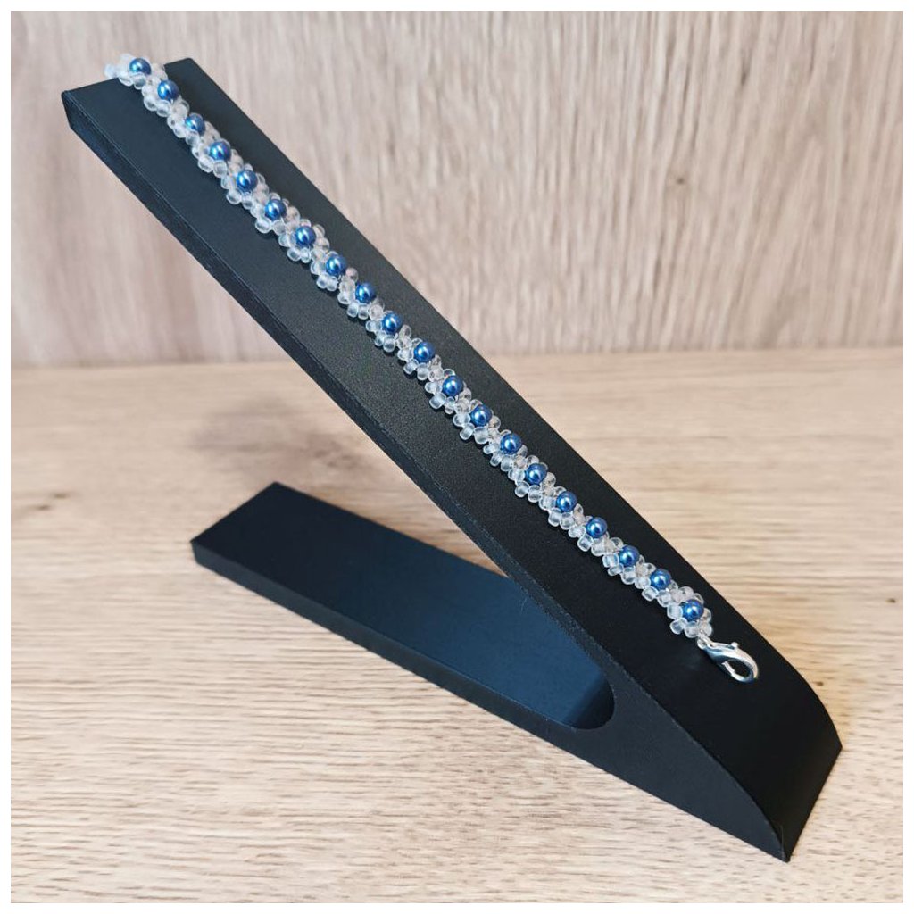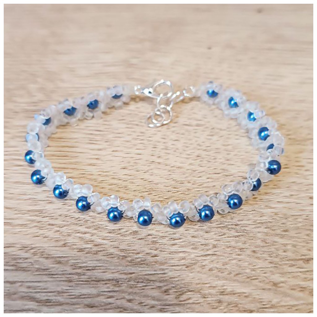 Náramek Bílé květy se vyznačuje jemným a vzdušným designem. Květinový vzor je tvořen tmavě modrými velkými jádry obklopenými bílými poloprůhlednými okvětními lístky.